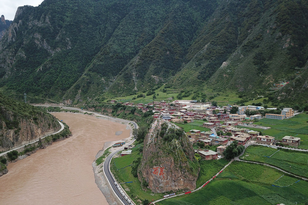 跨过川藏交界的金沙江,向西眺望,石山上“西藏”两个红字映入眼帘。石山旁的村庄就是昌都市江达县岗托镇岗托村。