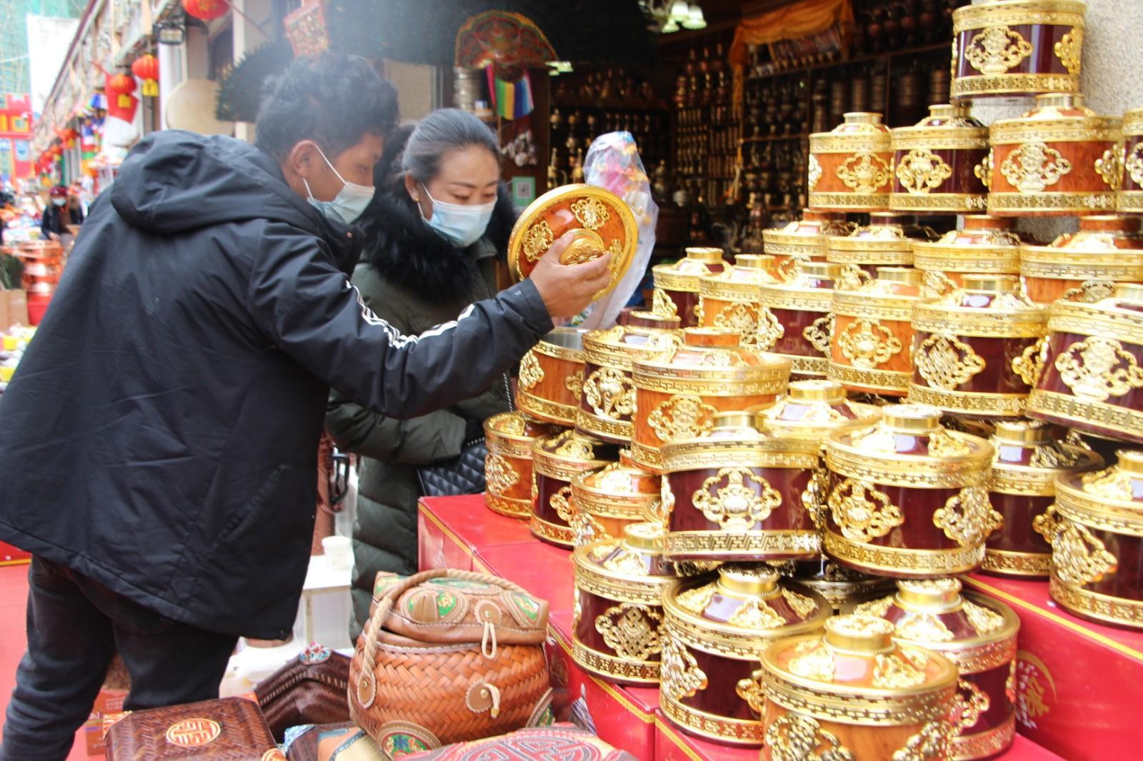 2022年藏历新年将至,山南大街小巷年味气息也越来越浓,不少市民忙着挑选各种各样的年货,卡塞、切玛盒、木碗......年货市场呈现购销两旺的红火景象。