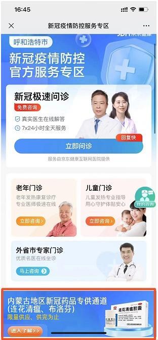 为有效解决新冠病毒感染者就医购药需求,呼和浩特市卫生健康委联合京东健康上线“呼和浩特市新冠疫情防控官方服务专区”平台,平台具备线上问诊、在线购药和健康科普等服务功能。