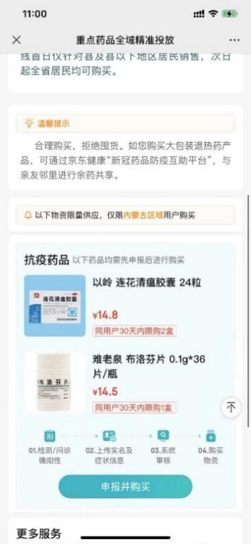 可进入专区“内蒙古地区新冠药品专供通道(连花清瘟、布洛芬)购买连花清瘟、布洛芬药品,用户需要点击申报并购买,上传个人信息完成实名认证后,需要提交抗原检测阳性结果或上传核酸检测阳性报告,也可以选择描述新冠症状,审核通过后即可在线购买精准投放物资。