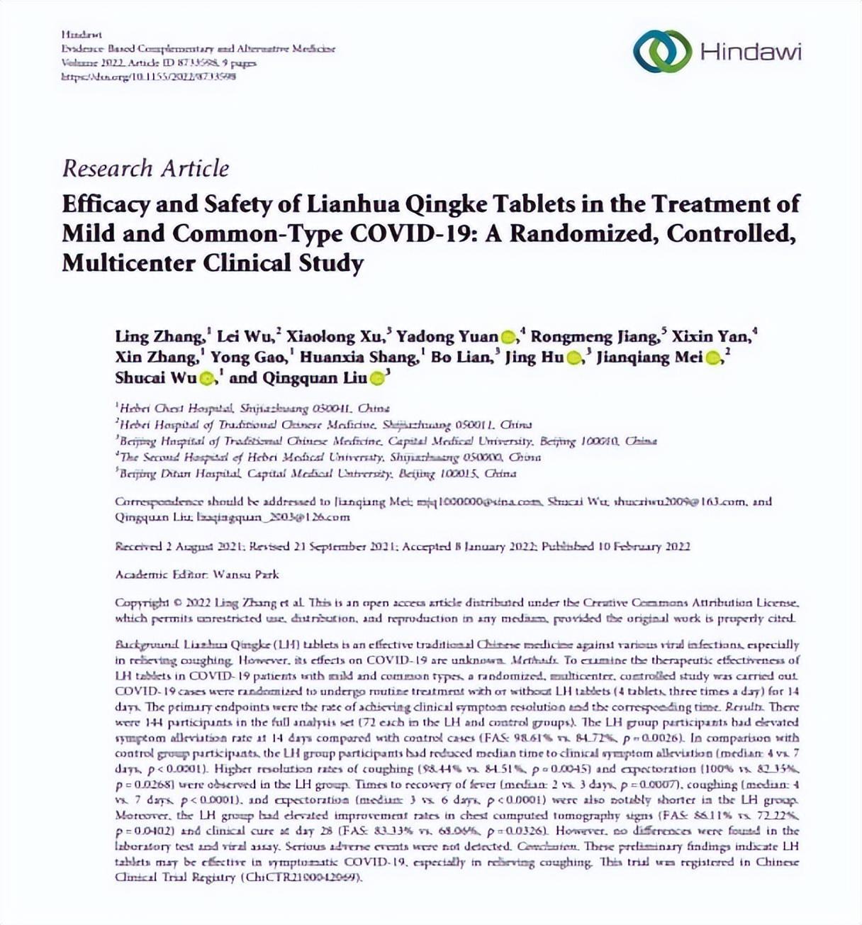 针对新冠病毒,连花清咳在多家国内重点实验室和药物安全评价中心开展了系列药理学研究。基础研究结果证实,连花清咳片在体外、体内均可抑制新冠病毒复制,并降低肺组织炎症,改善肺间质组织增生,抑制感染后体重降低,同时可调节系统性免疫功能。今年3月,刊发在国际学术期刊《循证补充和替代医学》上的题为《连花清咳片治疗轻型、普通型COVID-19的疗效和安全性的随机对照多中心临床研究》的科研论文就指出,连花清咳片治疗新冠肺炎较对照组,临床症状缓解率可达到98.61%,咳嗽咳痰缓解中位时间分别缩短3天,胸部CT表现改善率提高14%。连花清咳片可明显改善新冠肺炎患者咳嗽咳痰症状,提高呼吸功能,减轻肺损伤。