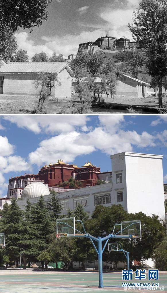 拼版照片:上图是20世纪50年代拍摄的西藏第一所现代正规初级中学——拉萨中学一角(新华社记者景家栋摄);下图是2021年8月9日拍摄的拉萨中学一角(新华社记者孙瑞博摄)。新华社发