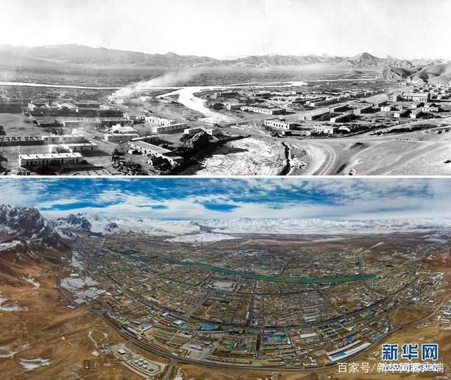 拼版照片:上图是20世纪80年代的西藏那曲地区行署所在地那曲镇(新华社记者袁克忠摄);下图是那曲市市区风貌(新华社发普布扎西摄,无人机视频截图)。新华社发