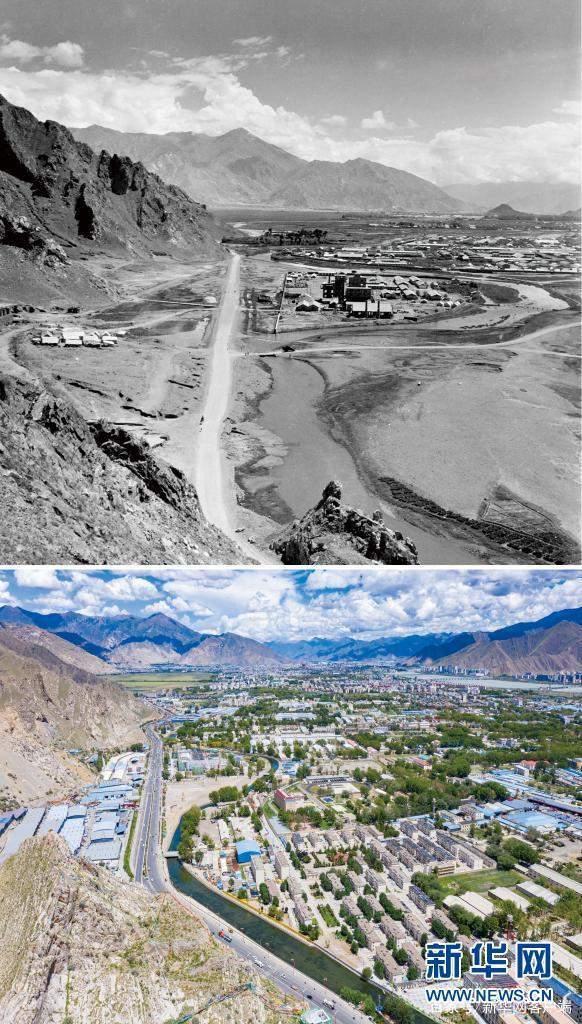 拼版照片:上图是20世纪60年代拍摄的拉萨市西郊景象(新华社发蓝志贵摄);下图是2021年8月9日拍摄的拉萨市西郊新貌(新华社记者普布扎西摄,无人机照片)。新华社发