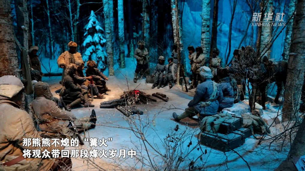“九·一八”历史博物馆内,抗联战士密林宿营地的模拟场景吸引观众驻足,那熊熊不熄的“篝火”,将观众带回那段烽火岁月中。