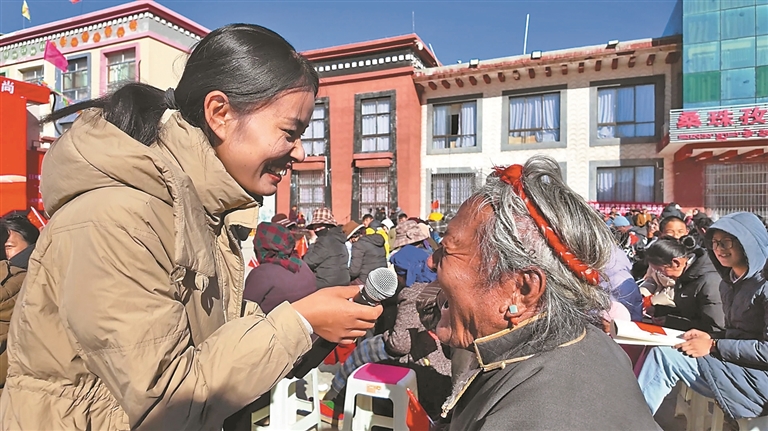 在定结县,自治区“十佳基层宣讲员”、日喀则市“珠峰百姓名嘴”、“雪莲花宣传队”队员拉珍连续主讲四场宣讲报告会,以“身边变化”宣讲自治区成立60年来的发展成就,村民们听得认真、记得仔细,互动环节更是踊跃参与。许多群众在宣讲结束后仍围着拉珍交谈,久久不愿散去,“这样的宣讲接地气、听得懂、记得牢,希望常来。”