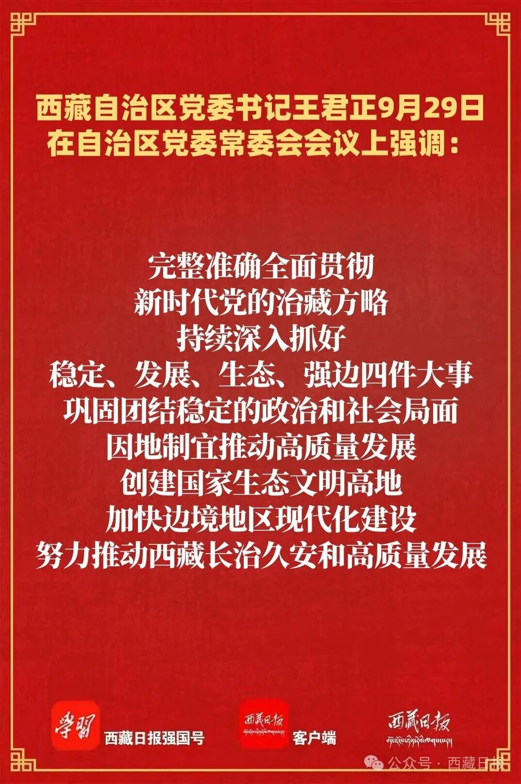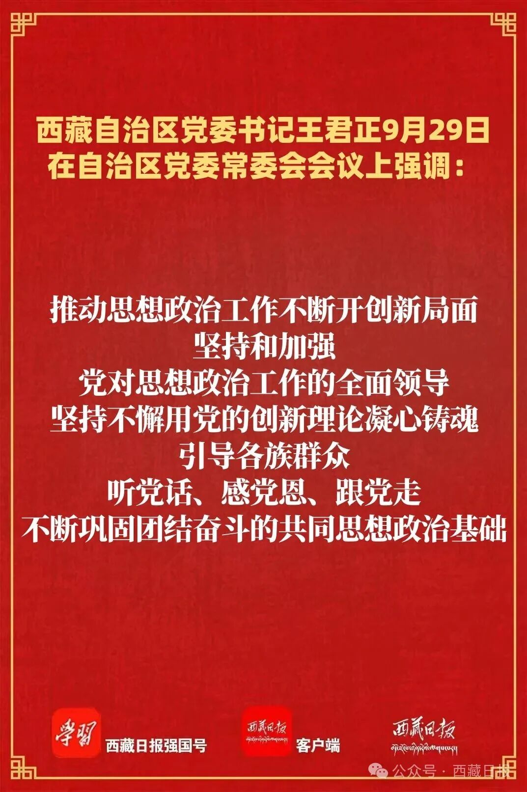 会议传达学习了习近平总书记在听取新疆维吾尔自治区党委和政府工作汇报时的重要讲话精神、在第八个“中国农民丰收节”到来之际作出的重要指示精神、对党校(行政学院)工作作出的重要指示精神和中共中央印发的《中国共产党思想政治工作条例》等。王君正指出,习近平总书记的重要讲话、重要指示,统筹国内国际两个大局,高屋建瓴、思想深邃、内涵丰富,科学回答了一系列重大理论和实践问题,具有很强的思想性、战略性、指导性,为我们做好西藏工作指明了前进方向、提供了根本遵循。全区各级各部门要把学习贯彻习近平总书记近期系列重要讲话精神,同学习贯彻习近平总书记关于西藏工作的重要指示和新时代党的治藏方略结合起来,同学习贯彻习近平总书记视察西藏时的重要讲话精神结合起来,聚焦“四件大事”聚力“四个创建”,恪尽职守、努力工作,确保习近平总书记重要指示和党中央决策部署在雪域高原落地生根、开花结果。