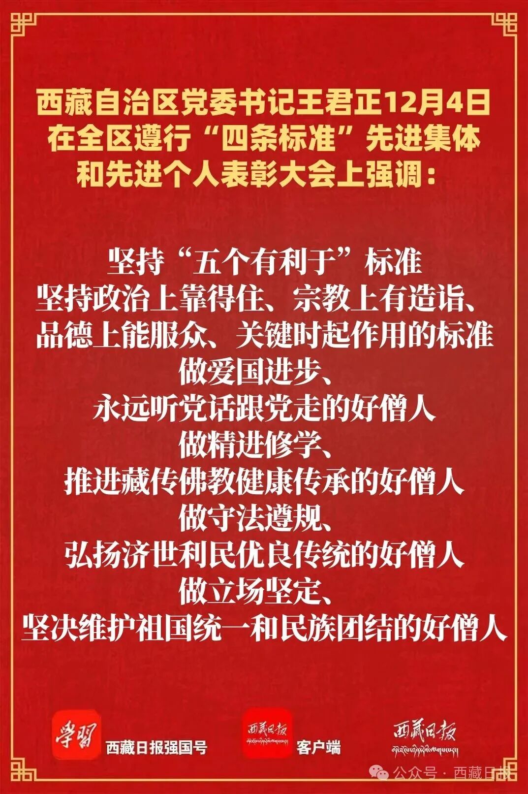 王君正强调,全区宗教界人士和广大僧尼要积极践行习近平总书记重要指示,坚持“五个有利于”标准,坚持政治上靠得住、宗教上有造诣、品德上能服众、关键时起作用的标准,做爱国进步、永远听党话跟党走的好僧人,做精进修学、推进藏传佛教健康传承的好僧人,做守法遵规、弘扬济世利民优良传统的好僧人,做立场坚定、坚决维护祖国统一和民族团结的好僧人,努力在促进民族团结、宗教和顺、西藏稳定发展进步中作出更大贡献。在爱国爱教、崇尚和谐上作标杆,衷心拥护中国共产党的领导,拥护社会主义制度,自觉维护祖国统一、民族团结,做到政治上靠得住。在修身立德、提高修为上作示范,潜心向学,弘扬佛法,深入研习宗教经典,娴熟掌握宗教仪轨,不断提升宗教修养,做到宗教上有造诣。在遵守法律、严守戒律上作表率,积极参与“学法规、守戒律、重修为、树形象”教育活动,秉持以戒为师的优良传统,用寺规戒律严格要求自己,做到品德上能服众。在护国利民、维护稳定上作贡献,进一步铸牢中华民族共同体意识、推进中华民族共同体建设,在大是大非面前立场坚定、旗帜鲜明,促进宗教和顺、社会和谐、民族和睦,做到关键时起作用。切实增强主人翁精神,参与社会主义现代化新西藏建设,紧紧围绕稳定、发展、生态、强边四件大事落实,推进“四个创建”取得新进展,为西藏更加美好的明天而不懈奋斗。