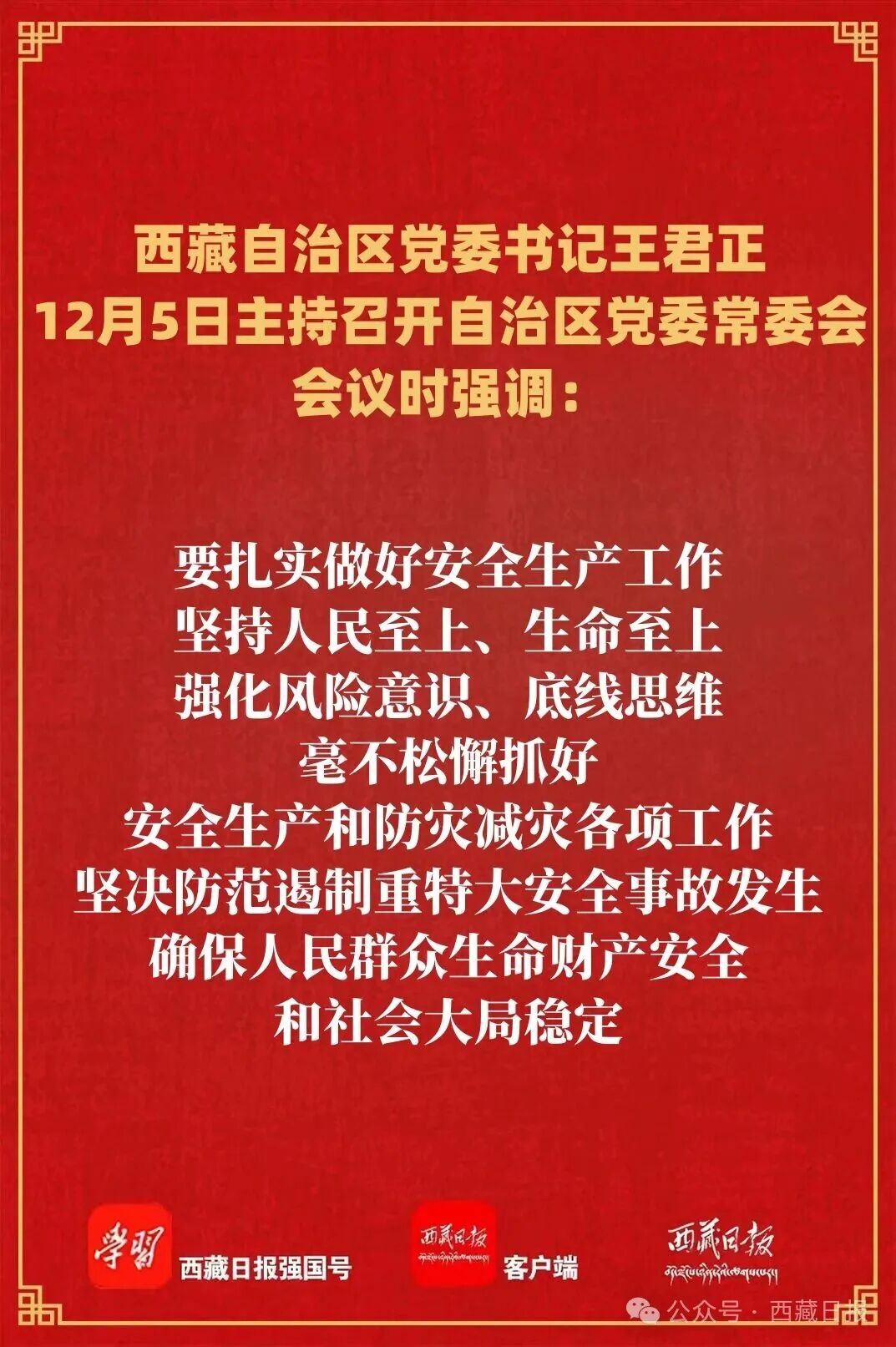 会议传达学习了习近平总书记对香港新界大埔区住宅楼重大火灾事故作出的重要指示精神。王君正强调,要扎实做好安全生产工作,坚持人民至上、生命至上,强化风险意识、底线思维,毫不松懈抓好安全生产和防灾减灾各项工作,坚决防范遏制重特大安全事故发生,确保人民群众生命财产安全和社会大局稳定。压紧压实安全生产责任制,以“时时放心不下”的责任感,健全安全风险监测预警体系,完善应急管理工作机制,广泛普及安全知识,强化安全提醒和教育,织密扎牢安全防护网。全面加强消防安全管理,围绕排查重点任务,扎实开展重大火灾风险隐患排查整治行动,发现问题及时整改到位,努力把风险隐患消除在萌芽状态。坚持举一反三,从西藏实际出发,加强森林草原防火、雨雪冰冻灾害、道路交通等重点领域监管,充分动员群防群治力量开展风险隐患排查整治,坚决守牢安全底线,建设更高水平的平安西藏。
