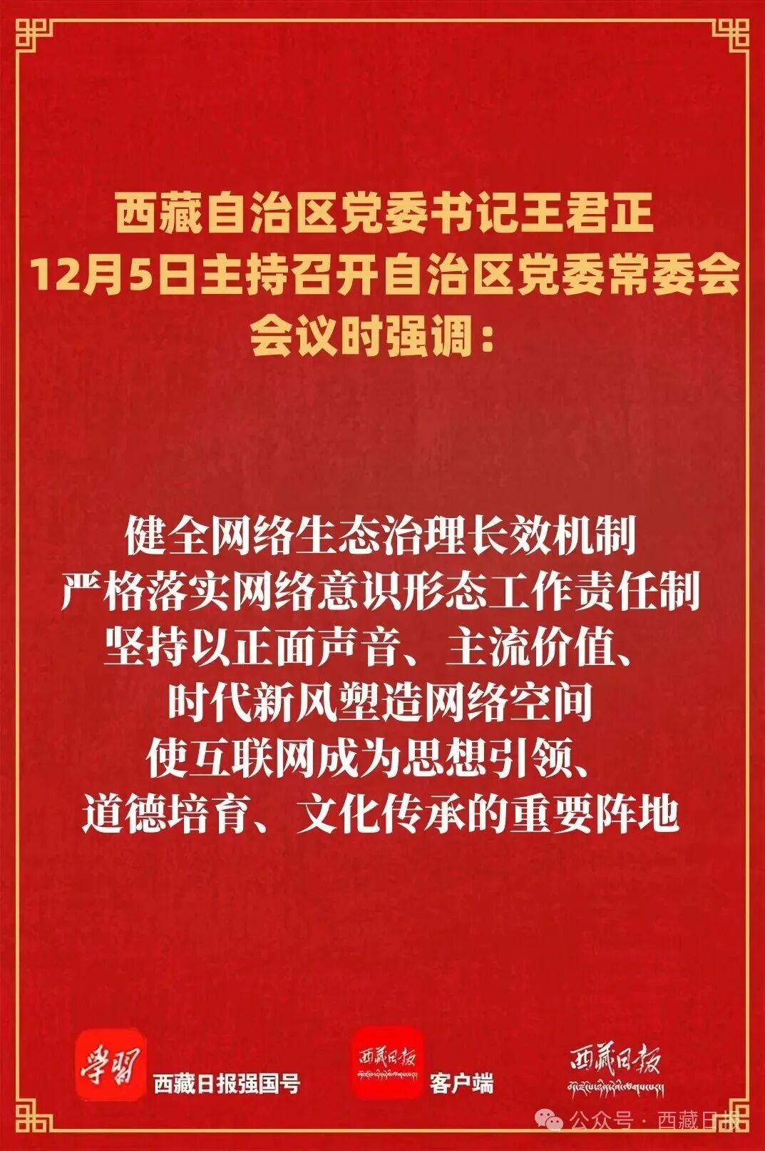 王君正强调,要坚持理论联系实际的学风,努力把学习成果转化为建设社会主义现代化新西藏的强大动力。传承红色基因、赓续红色血脉,广泛开展革命传统教育,大力弘扬伟大建党精神和“两路”精神、老西藏精神、孔繁森精神,坚定理想信念,厚植为民情怀,切实把对老一辈革命家的怀念和敬仰之情,转化为干事创业的强大动力和实际成效。健全网络生态治理长效机制,严格落实网络意识形态工作责任制,坚持以正面声音、主流价值、时代新风塑造网络空间,使互联网成为思想引领、道德培育、文化传承的重要阵地;依法加强网络空间治理,强化源头治理、综合施治,持续开展清朗、净网等专项行动,营造风清气正的网络空间。积极服务国家总体外交大局,持续完善口岸基础设施和边贸物流产业体系,加强开放平台建设,深化与周边国家友好往来、务实合作,更好融入共建“一带一路”;不断提升国际传播能力,讲好新时代西藏故事,让世界更好了解西藏,让西藏更快走向世界。推动清洁能源高质量发展,立足资源禀赋和区位特点,全面推进能源全链条产业布局,推动水风光一体化协同发展,加快建设电力外送通道,不断探索能源合作新模式,努力把资源优势转化为经济优势、发展优势。健全志愿服务体系,大力弘扬志愿精神,丰富志愿服务内容,培树志愿服务品牌,鼓励引导志愿服务组织和志愿者积极参与社会主义现代化新西藏建设,构建起多部门联动、多行业参与的新时代志愿服务格局。