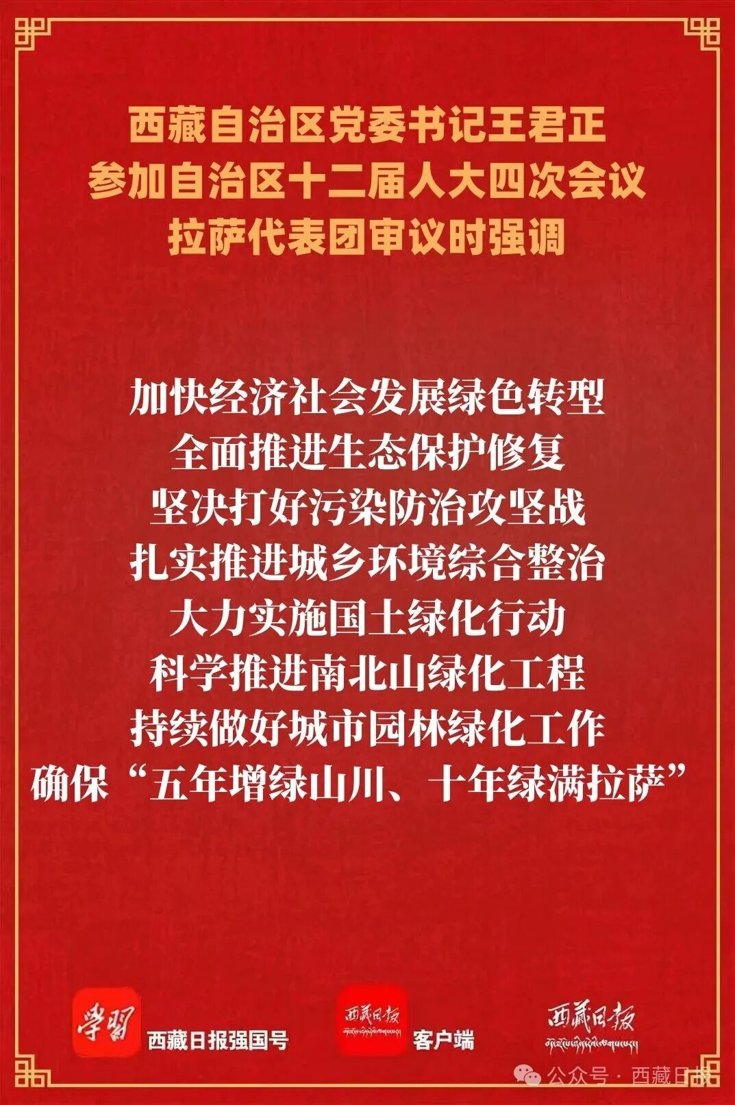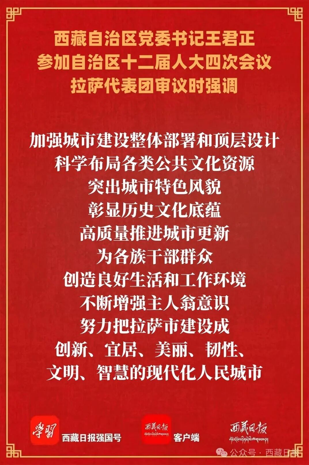 1月31日,自治区党委书记王君正参加他所在的自治区十二届人大四次会议拉萨代表团审议时强调,要全面深刻准确贯彻落实党的二十届四中全会精神,深入贯彻习近平总书记关于西藏工作的重要指示和新时代党的治藏方略,为“十五五”开好局起好步当好全区长治久安和高质量发展排头兵,努力为社会主义现代化新西藏建设作出更大贡献。