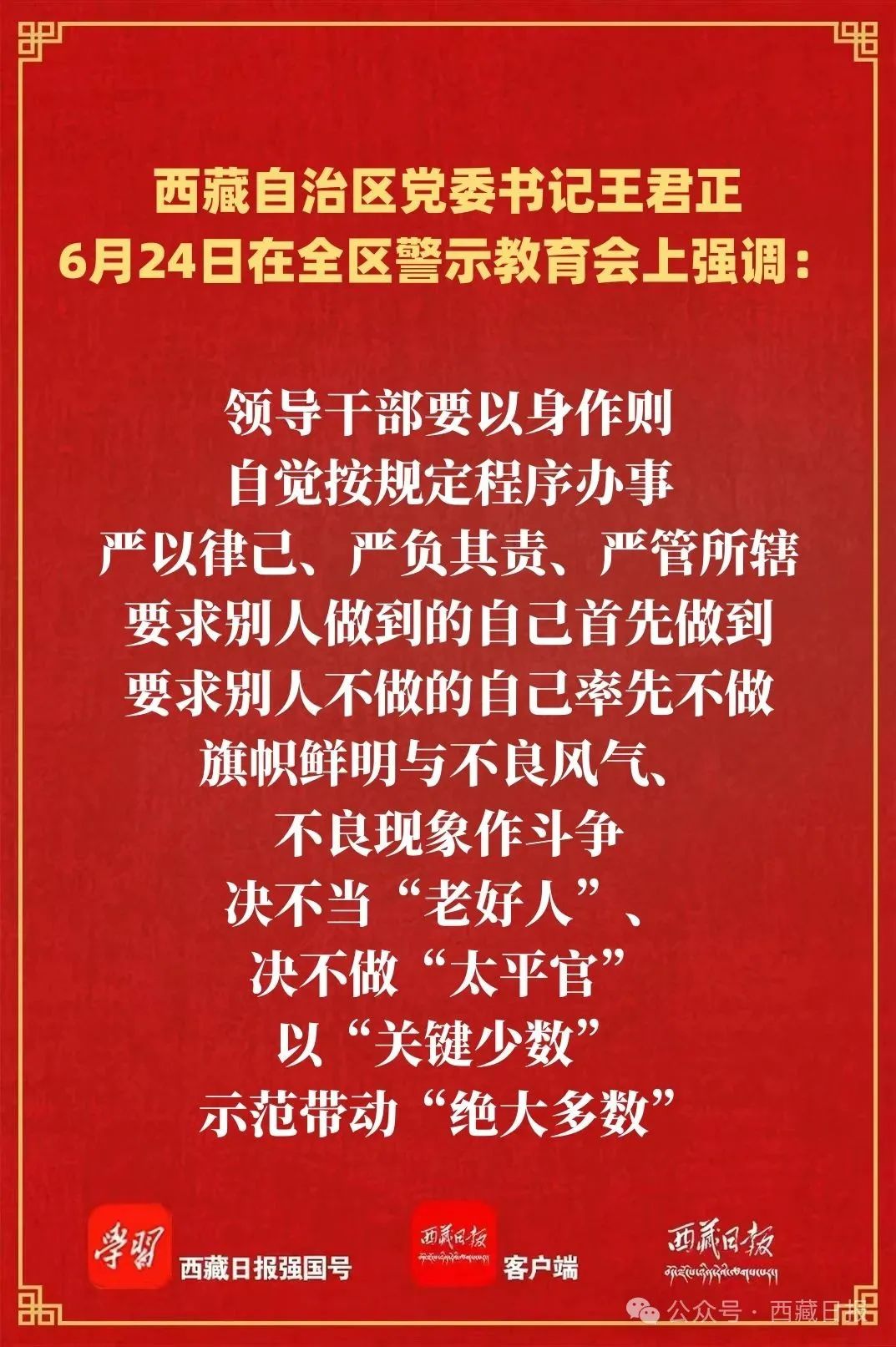 王君正强调,要坚持以案为鉴、警钟长鸣,进一步筑牢正风肃纪、拒腐防变的思想防线。提高政治站位、坚持党性原则,坚定做政治上的明白人。深入学习贯彻习近平总书记关于西藏工作的重要指示和新时代党的治藏方略,坚持不懈用党的创新理论武装头脑、指导实践、推动工作;严明政治纪律和政治规矩,自觉用“七个有之”自警自省,做到言行一致、表里如一,始终在思想上政治上行动上同以习近平同志为核心的党中央保持高度一致。坚持人民至上、践行人民宗旨,坚定做各族群众的贴心人。坚持人民立场,走好新时代党的群众路线,自觉同人民群众想在一起、干在一起,把群众身边的小事当作党委、政府的大事来抓,着力解决群众最关心最直接最现实的利益问题,让改革发展成果更多更公平惠及人民群众。改进作风、狠抓落实,坚定做干事创业的带头人。增强大局意识,善于把自身工作置于全局中思考谋划推动,找准在发展中的定位,让工作举措更加符合全局需要、更有利于地方和部门长远发展,谋事要勤、做事要细、成事要实,在其位谋其政尽其责,真正做到恪尽职守。牢固树立正确政绩观,坚定做实干奉献的奋斗者。坚决克服形式主义、官僚主义,以“功成不必在我”的精神境界和“功成必定有我”的历史担当,多做打基础、利长远的事,真心实意为群众谋福利、办实事,切忌急功近利、盲目决策、蛮干硬干、弄虚作假,努力创造经得起历史和人民检验的实绩。严守纪律规矩、坚守清正廉洁,坚定做严以律己的践行者。牢固树立正确的权力观,时刻以党章党规党纪为镜,严以修身、严以用权、严以律己,模范践行社会主义核心价值观,本色做人、角色做事,严把政治关、权力关、交往关、生活关、亲情关,自觉净化社交圈、生活圈、朋友圈,以良好家风促进党风政风、带动社风民风。