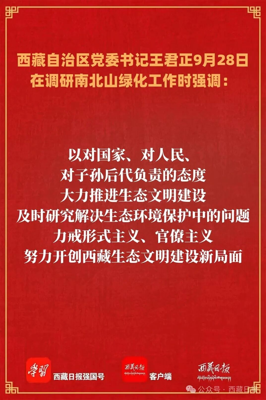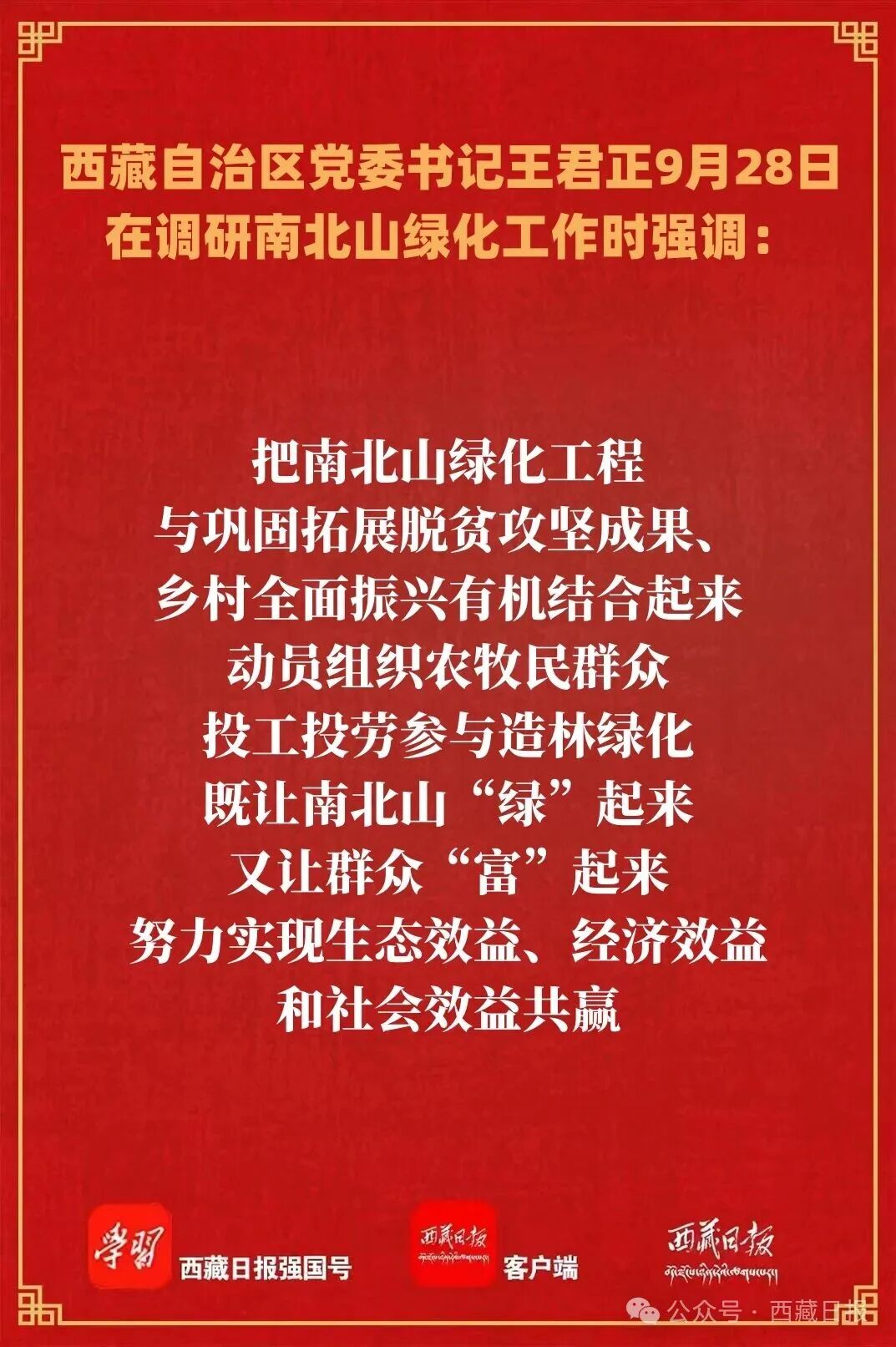王君正强调,要深入贯彻落实习近平生态文明思想,扎实推进国家生态文明高地创建,加快美丽西藏建设。深刻认识西藏最大的价值在生态、最大的责任在生态、最大的潜力也在生态,正确把握生态安全和发展安全、经济建设和生态文明建设、社会建设和生态文明建设、继承传统和创新发展的关系,把保护生态环境作为一切发展的前提和基础,努力实现在保护中加快高质量发展、在发展中实现更高水平的保护。要以法治思维、法治方式加强生态环境保护,认真落实青藏高原生态保护法及自治区环境保护条例,坚决防止“两高一低”企业和项目上青藏高原,“零容忍”打击生态环境违法犯罪行为,提升生态文明建设法治化水平,切实守护好雪域高原的生灵草木、万水千山。要科学开展南北山绿化工程,准确把握国土绿化行动的新形势和新要求,遵循“适地适树”原则,加强苗木选育、管护巡查等全过程监管,把成活率作为衡量造林成效的硬指标和重要依据,坚持向科技要动能、要效率,构建数字化、智慧化监管网络,持续推动南北山绿化工作高质量开展。要把“不断满足人民对美好生活的向往”作为工作出发点和落脚点,坚持绿化为了人民、绿化依靠人民、绿化成果由人民共享,把南北山绿化工程与巩固拓展脱贫攻坚成果、乡村全面振兴有机结合起来,动员组织农牧民群众投工投劳参与造林绿化,既让南北山“绿”起来,又让群众“富”起来,努力实现生态效益、经济效益和社会效益共赢。引导全社会树立生态文明理念,总结经验、巩固成果,将行之有效的好做法上升为制度机制,讲好新时代西藏造林故事,凝聚全民力量书写美丽西藏新篇章。