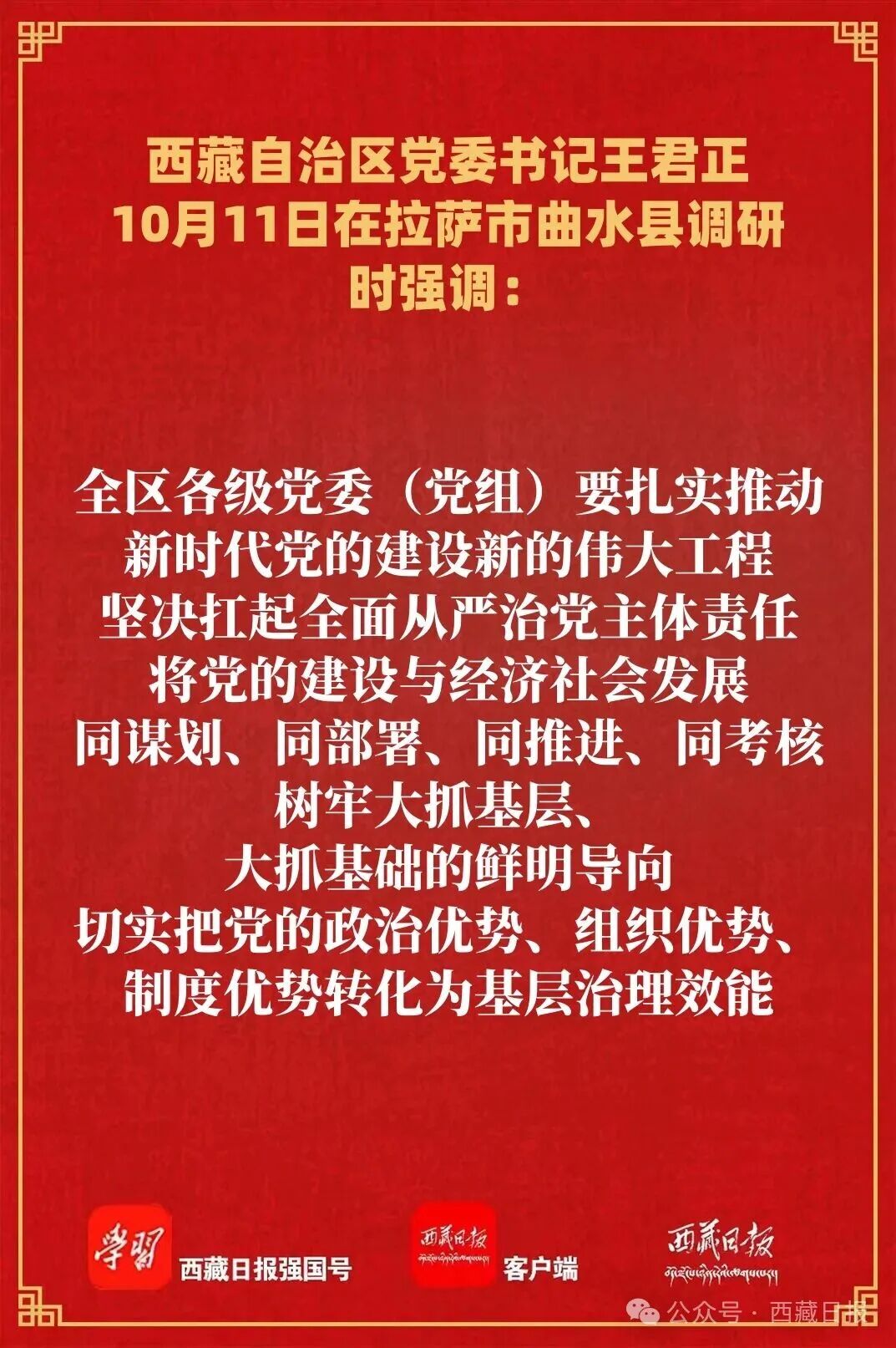 调研中,王君正强调,全区各级党委(党组)要扎实推动新时代党的建设新的伟大工程,坚决扛起全面从严治党主体责任,将党的建设与经济社会发展同谋划、同部署、同推进、同考核,树牢大抓基层、大抓基础的鲜明导向,切实把党的政治优势、组织优势、制度优势转化为基层治理效能。加强凝心铸魂、进一步提升基层党组织的思想引领力,强化党的创新理论武装,抓实基层宣传宣讲,用通俗易懂的语言和喜闻乐见的方式,把党的路线方针政策宣传到基层、宣传到群众,讲好新时代西藏故事,深化拓展“三个意识”教育,引导各族群众不断增强“五个认同”。突出政治引领、进一步提升基层党组织的政治领导力,以党的政治建设为统领,坚持问题导向、补齐工作短板,扎实推进村(社区)“两委”班子建设,加强组织领导,压实工作责任,建强干部队伍,教育引导党员干部严守政治纪律和政治规矩,努力做忠诚干净担当的新时代好干部。坚持人民至上、进一步提升基层党组织的群众组织力,把群众身边的小事当作党委、政府的大事来抓,提升人口素质、推进人心凝聚、加强人才培养,坚决整治群众身边的不正之风和腐败问题。强化党建赋能、进一步提升基层党组织的社会号召力,深化党建引领基层治理,健全党组织领导的自治、法治、德治相结合的基层治理体系,完善网格化管理、精细化服务、信息化支撑的基层治理平台,优化矛盾风险隐患排查化解机制,不断提升基层治理体系和治理能力现代化水平。