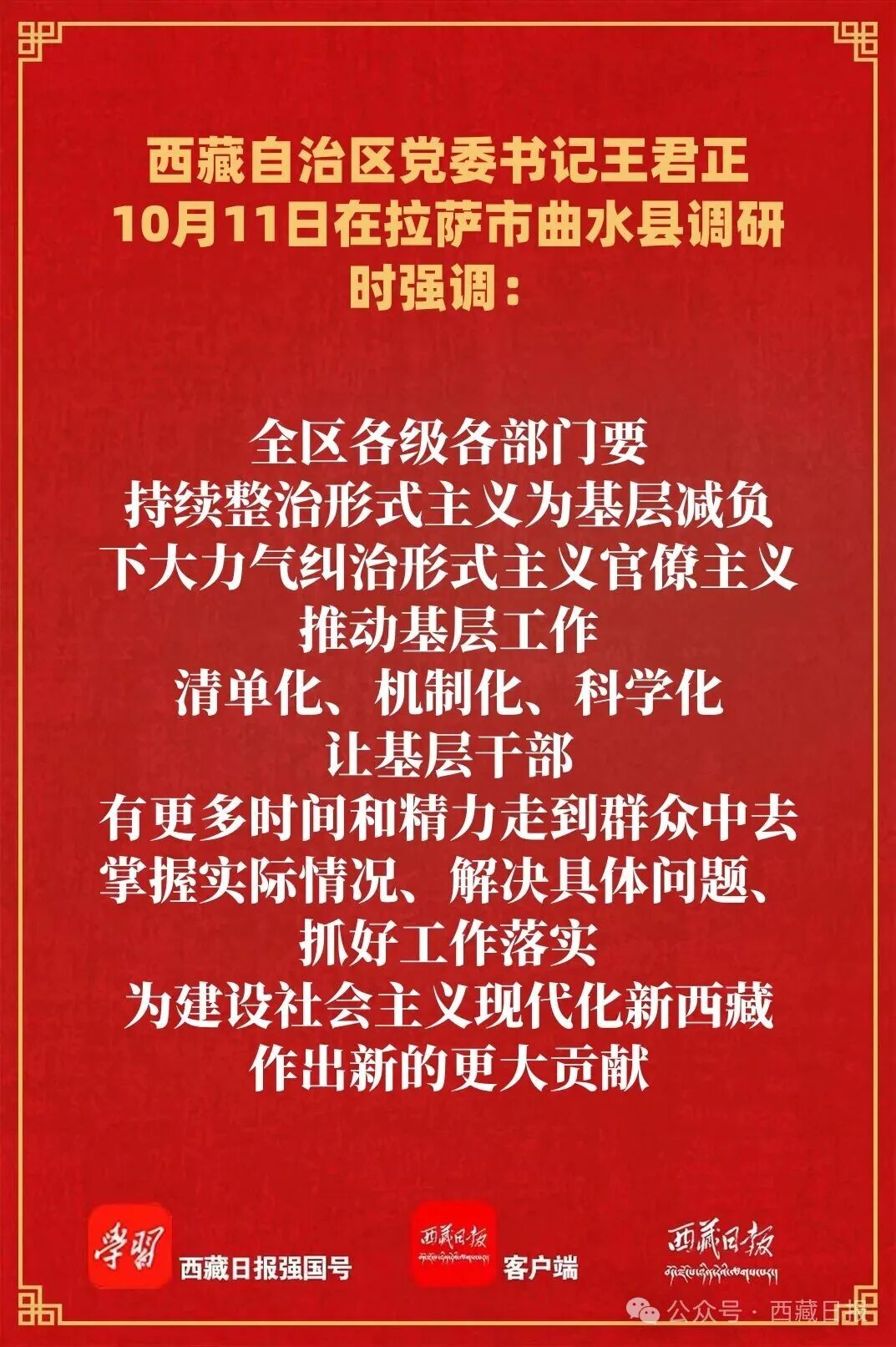 王君正强调,全区各级各部门要持续整治形式主义为基层减负,下大力气纠治形式主义官僚主义,推动基层工作清单化、机制化、科学化,让基层干部有更多时间和精力走到群众中去,掌握实际情况、解决具体问题、抓好工作落实,为建设社会主义现代化新西藏作出新的更大贡献。