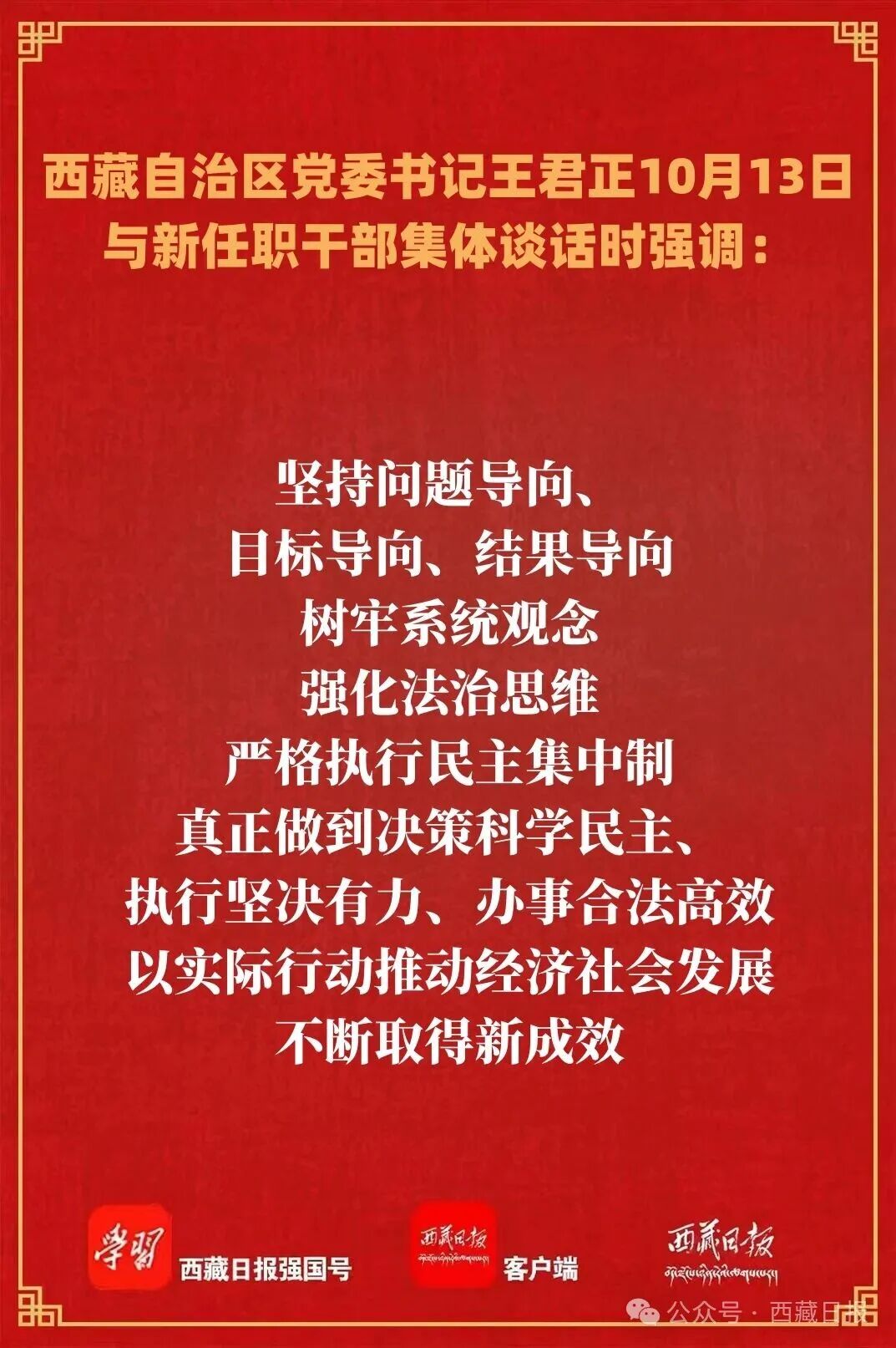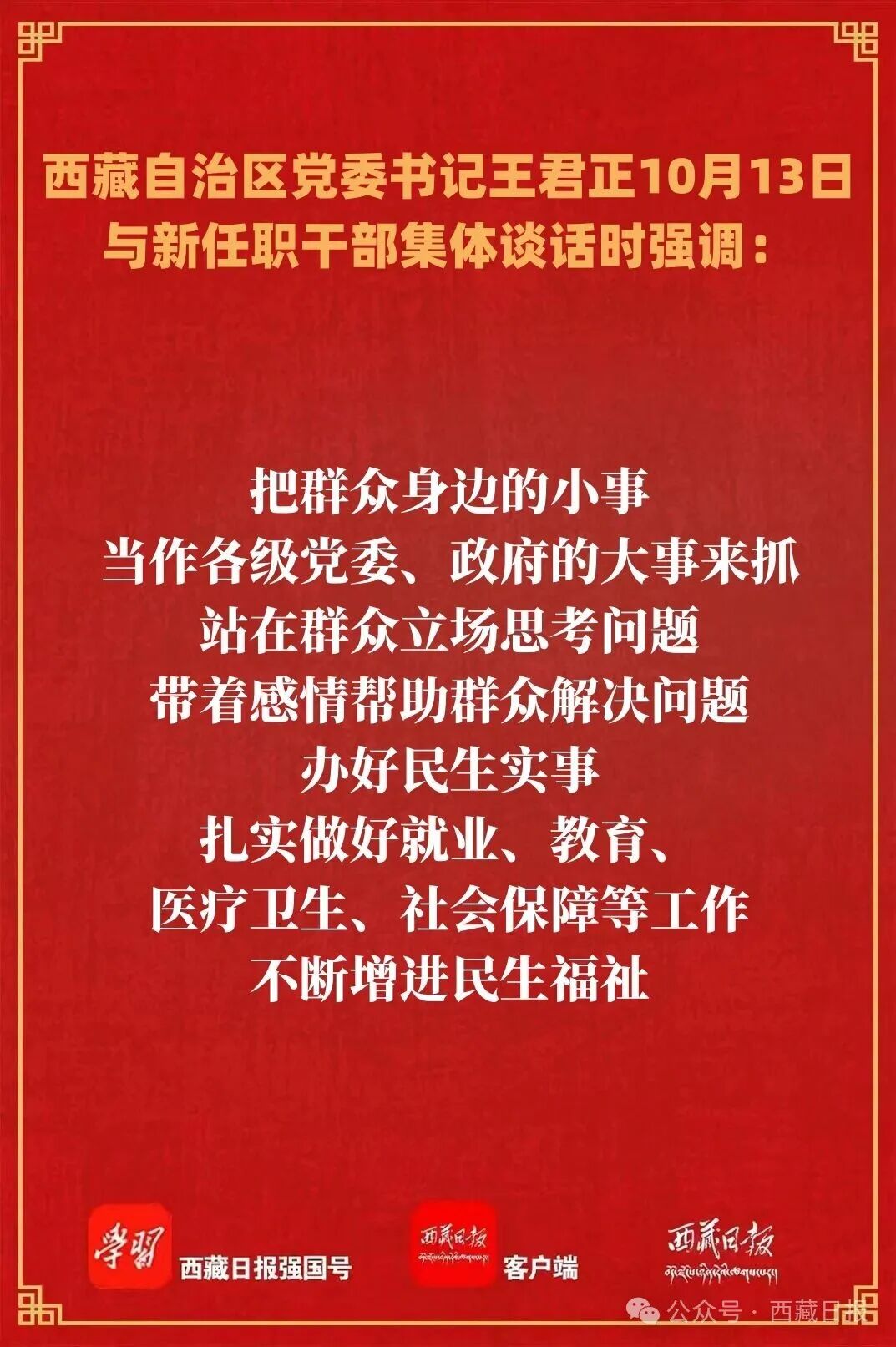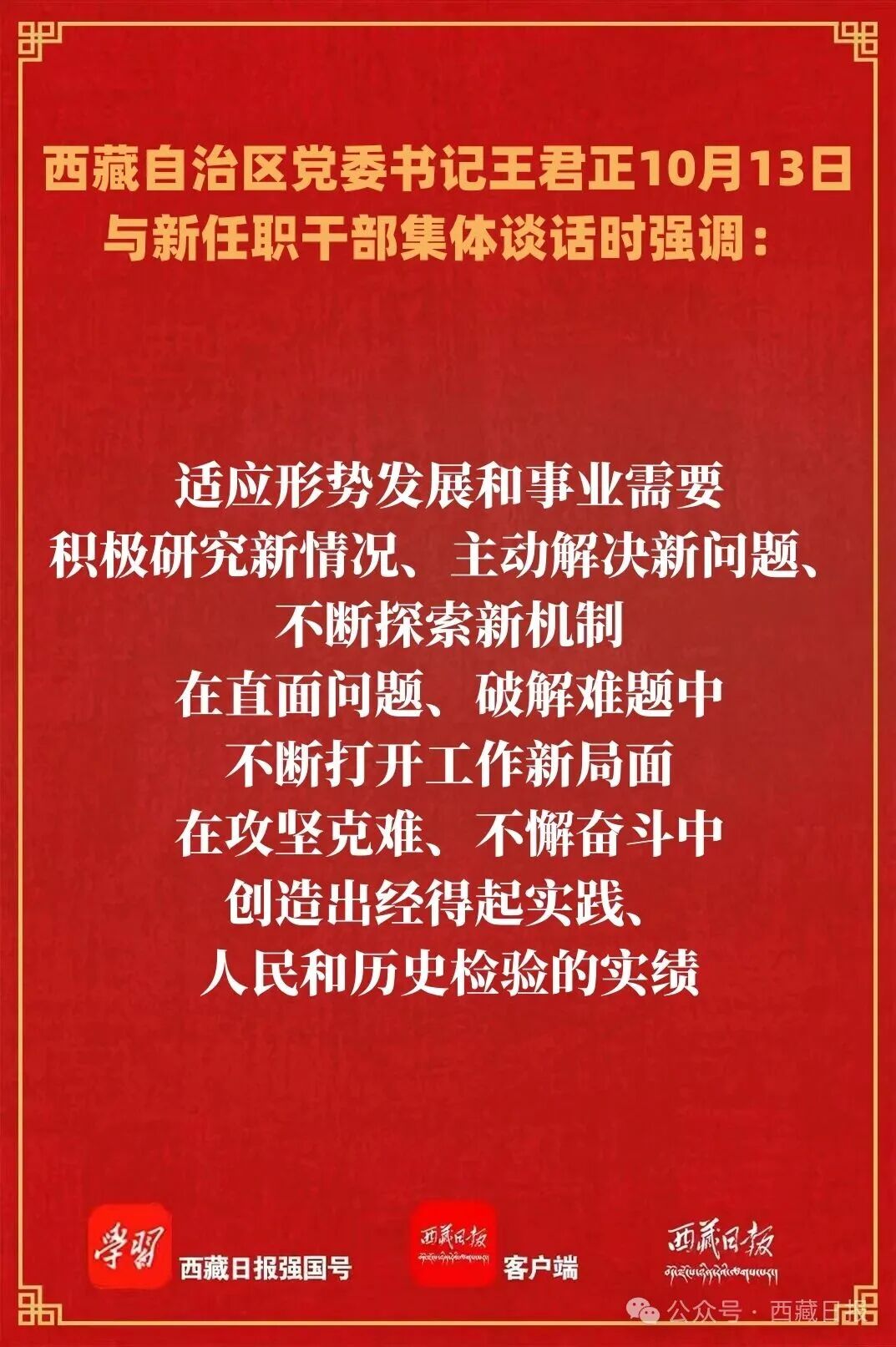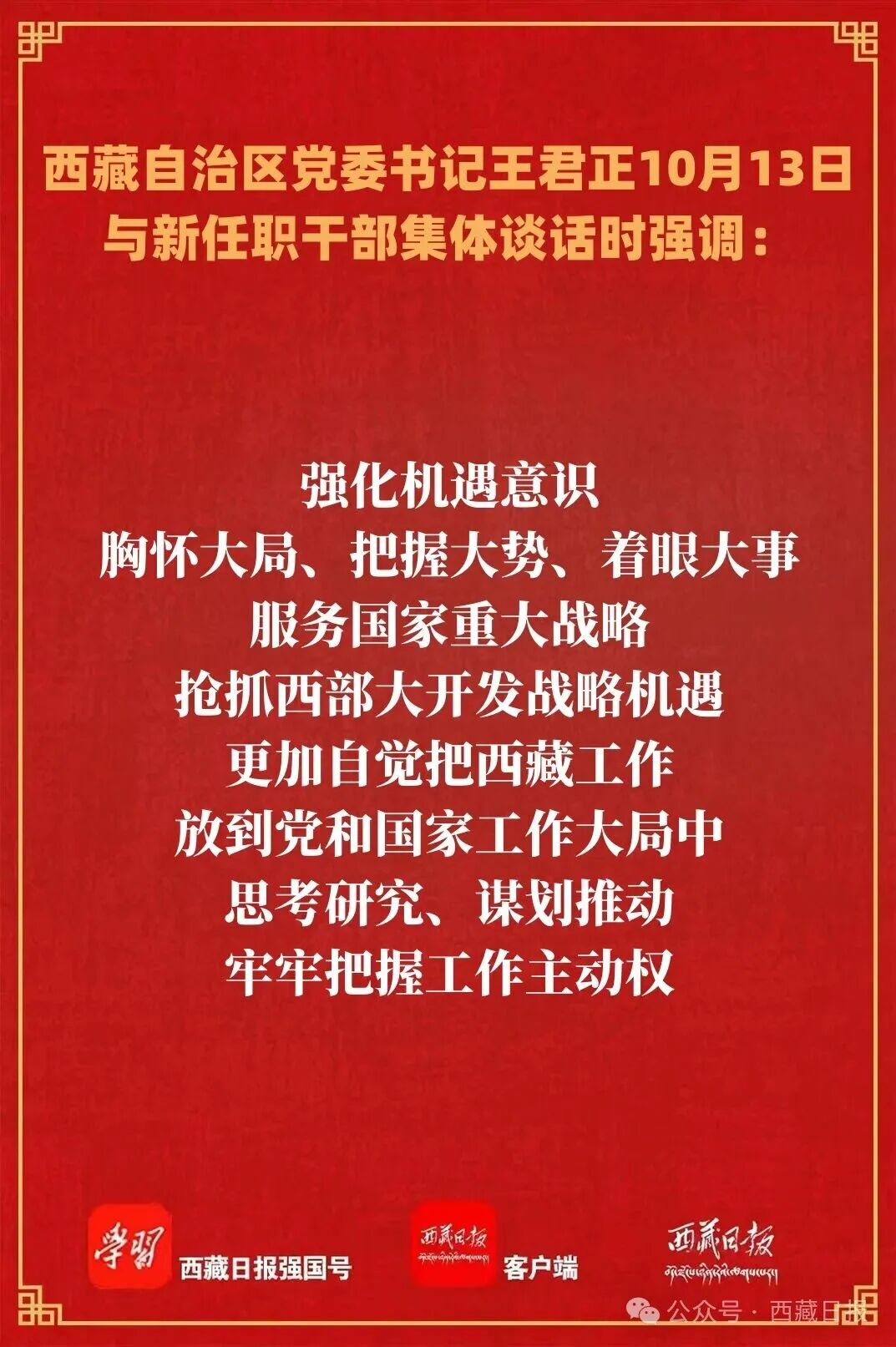 10月13日,自治区党委书记王君正在拉萨与新任职干部集体谈话。他强调,要深入贯彻落实习近平总书记关于西藏工作的重要指示和新时代党的治藏方略,发扬光荣传统,弘扬优良作风,不断提升政治修养和业务能力,做党和人民放心满意的好干部。