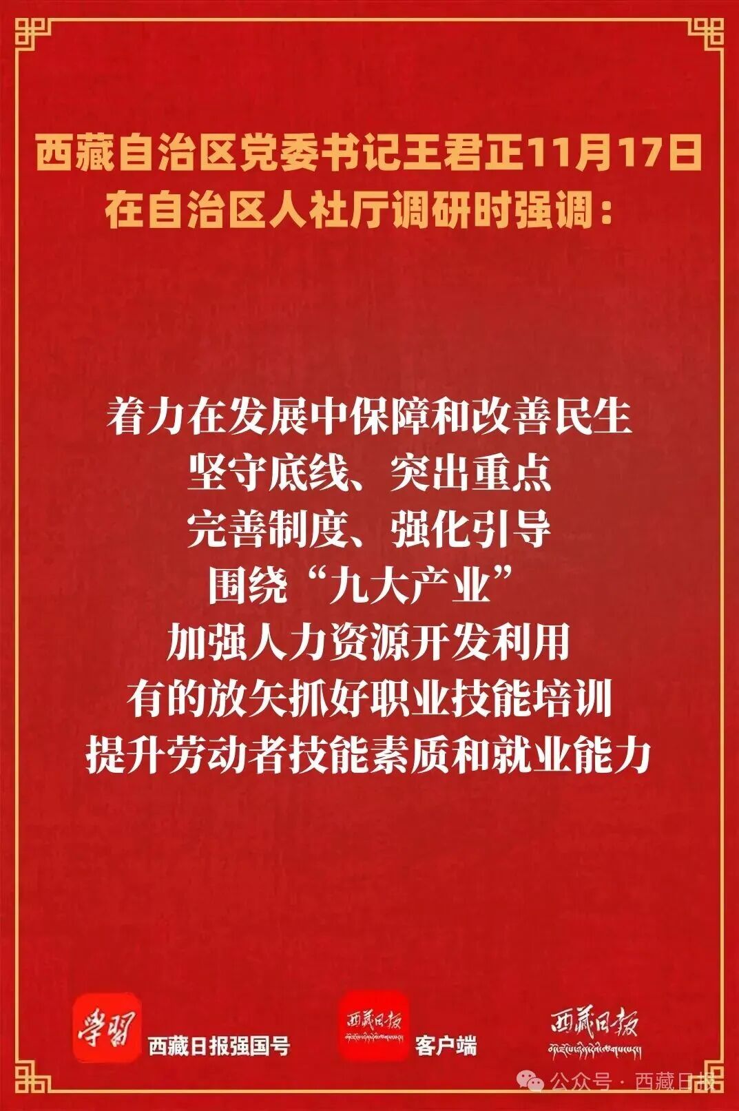 11月17日,自治区党委书记王君正在自治区人力资源和社会保障厅调研时强调,要深入贯彻落实党的二十届四中全会精神,坚持以人民为中心的发展思想,加大保障和改善民生力度,为社会主义现代化新西藏建设作出更大贡献。