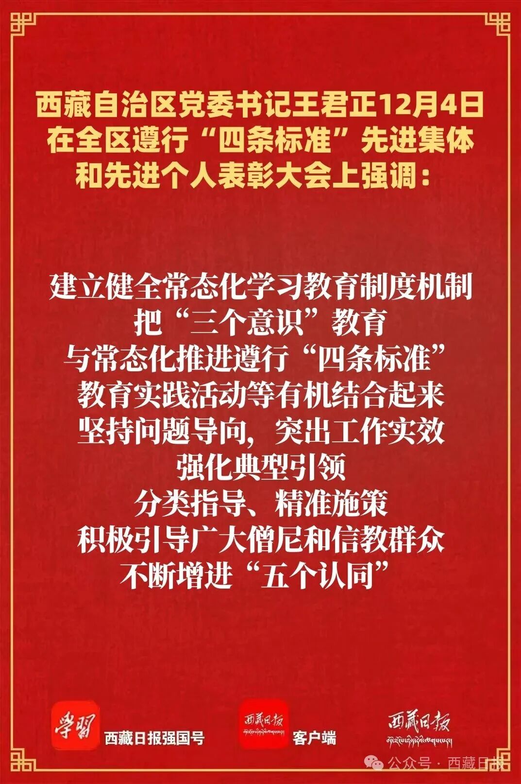 12月4日,全区遵行“四条标准”先进集体和先进个人表彰大会在拉萨举行。自治区党委书记王君正出席并讲话,强调要深入学习贯彻党的二十届四中全会精神,贯彻落实习近平总书记关于宗教工作、西藏工作的重要指示和新时代党的治藏方略,贯彻落实习近平总书记视察西藏时的重要讲话精神,按照自治区党委十届九次全会部署要求,突出分类指导,强化典型引领,积极推进藏传佛教中国化,努力为建设社会主义现代化新西藏凝聚力量。