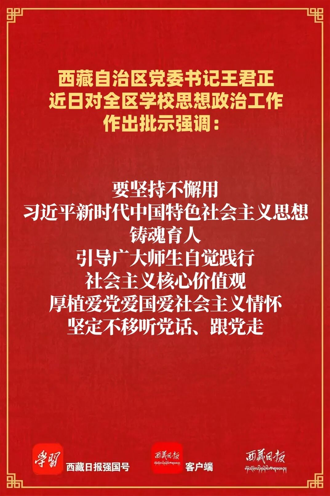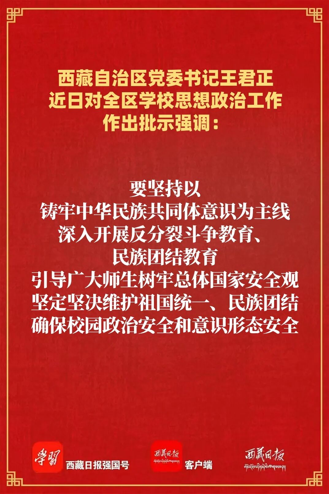 王君正强调,思想政治工作是学校各项工作的生命线。全区教育系统要深刻领悟“两个确立”的决定性意义,坚决做到“两个维护”,深入贯彻落实习近平总书记关于教育工作、西藏工作的重要指示和新时代党的治藏方略,牢记为党育人、为国育才初心使命,围绕“培养什么人、怎样培养人、为谁培养人”这个根本问题,深化学校思政课建设改革,不断提升思政课的引领力。要坚持不懈用习近平新时代中国特色社会主义思想铸魂育人,引导广大师生自觉践行社会主义核心价值观,厚植爱党爱国爱社会主义情怀,坚定不移听党话、跟党走。要坚持以铸牢中华民族共同体意识为主线,深入开展反分裂斗争教育、民族团结教育,引导广大师生树牢总体国家安全观,坚定坚决维护祖国统一、民族团结,确保校园政治安全和意识形态安全。要聚焦“四件大事”聚力“四个创建”,推动思政教育与治藏稳藏兴藏实践有机结合起来,培养更多担当社会主义现代化新西藏建设的时代新人。