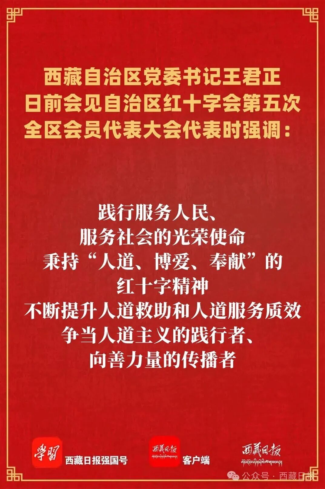 近日,自治区红十字会第五次全区会员代表大会在拉萨召开。会议强调,要深刻领悟“两个确立”的决定性意义,坚定坚决做到“两个维护”,持续深化改革创新,不断强化能力建设,在应急救援、生命守护、民族团结、人道传播等方面展现新作为,奋力谱写西藏红十字事业高质量发展新篇章。