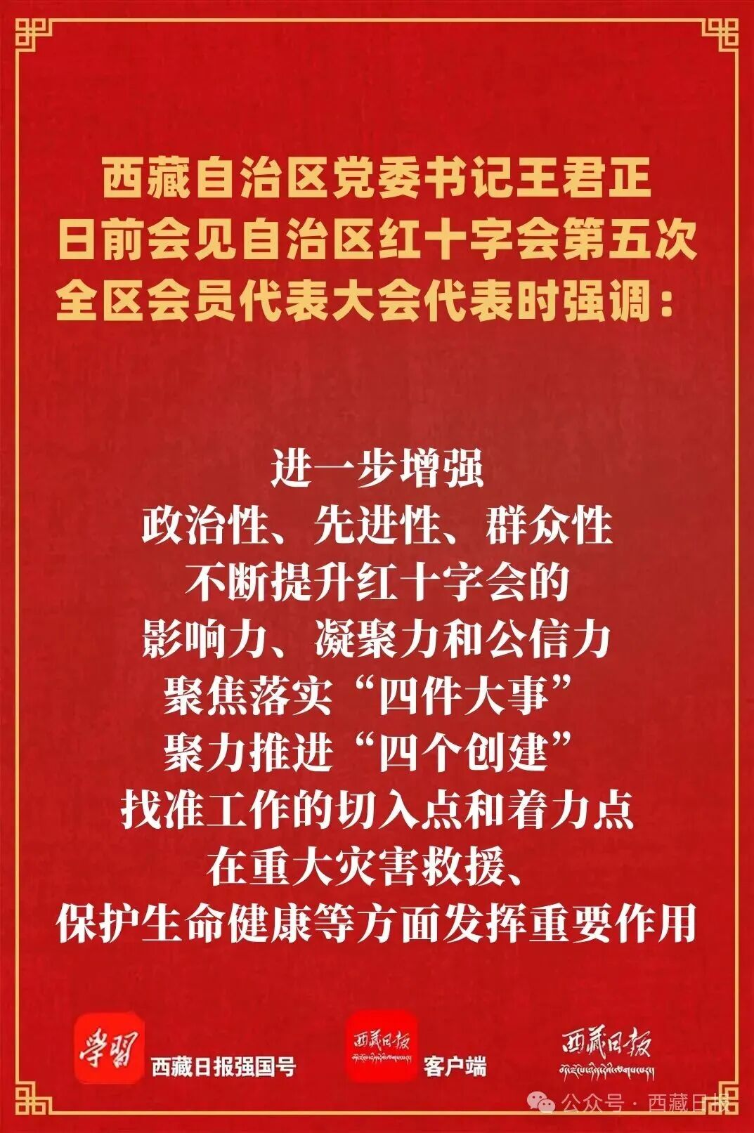 日前,自治区党委书记王君正在拉萨会见自治区红十字会第五次全区会员代表大会代表。他强调,要深入贯彻落实党的二十届四中全会精神和习近平总书记关于红十字事业的重要指示批示精神,聚焦主责主业,提高服务能力,努力推动全区红十字事业高质量发展,为建设社会主义现代化新西藏作出更大贡献。