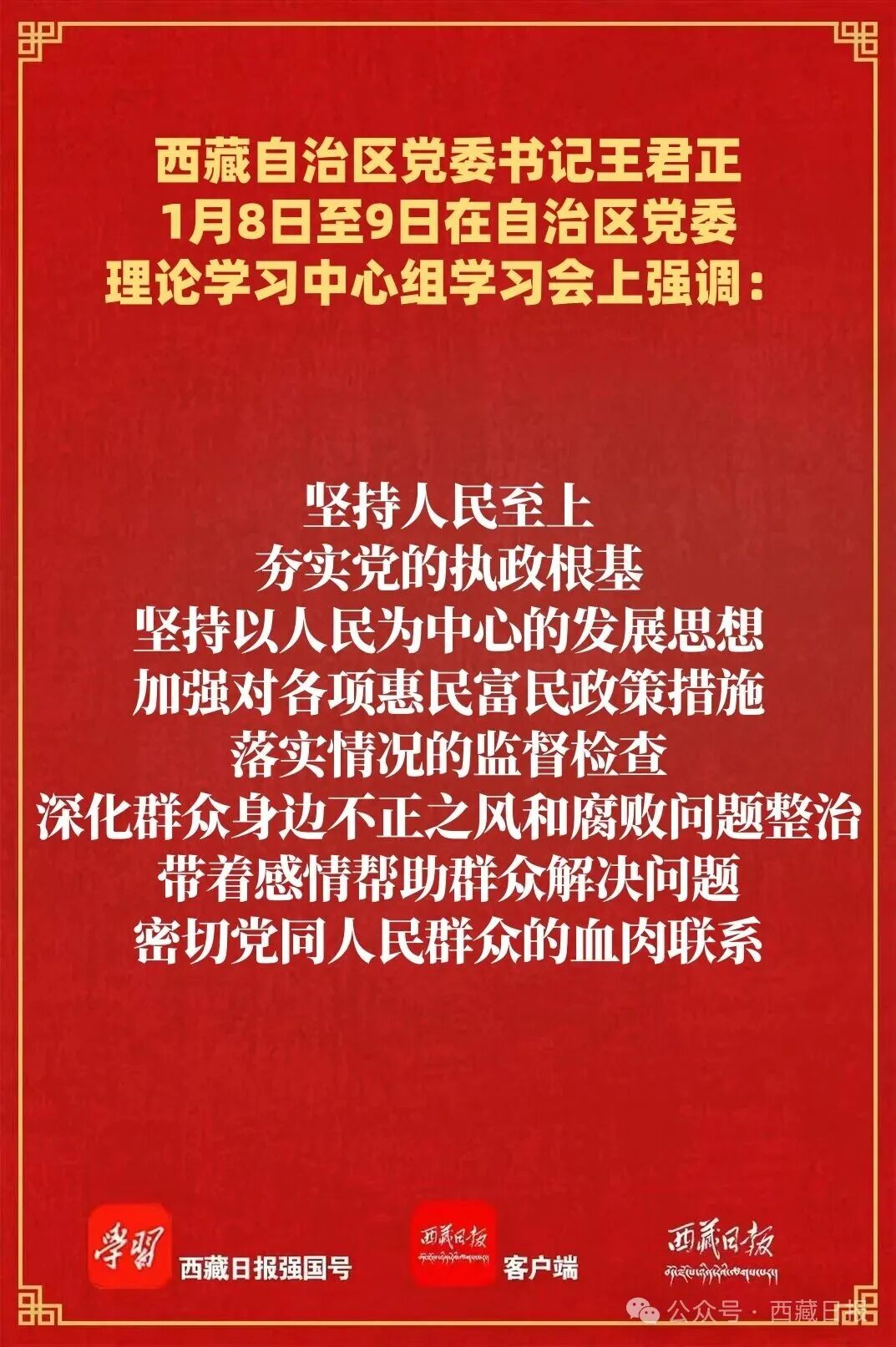 王君正强调,要弘扬理论联系实际的学风,恪尽职守、努力工作,以求真务实的精神推动社会主义现代化新西藏建设。不断提高政治站位,确保党中央政令畅通。坚持“第一议题”抓学习、“第一遵循”抓贯彻、“第一政治要件”抓落实,严明政治纪律和政治规矩,做到党中央提倡的坚决响应、党中央决定的坚决执行、党中央禁止的坚决不做,扎实抓好中央巡视反馈意见整改,及时组织“回头看”,确保西藏各项工作始终沿着习近平总书记指引的方向前进。坚持人民至上,夯实党的执政根基。坚持以人民为中心的发展思想,加强对各项惠民富民政策措施落实情况的监督检查,深化群众身边不正之风和腐败问题整治,带着感情帮助群众解决问题,密切党同人民群众的血肉联系。立足全局、联系实际,推动“四件大事”落实。增强大局意识、坚持系统观念,自觉站在党和国家全局思考谋划西藏工作、审视西藏发展大势,把握好全局和局部、当前和长远的关系,积极研究新情况、主动解决新问题,做到前瞻性思考、全局性谋划、整体性推进。坚持标本兼治,完善工作体制机制。建立健全基层权责清单,持续整治形式主义为基层减负,把中央要求、群众期盼、实际需要、实践经验结合起来,以刚性制度规定和严格制度执行,确保作风建设常态化长效化。