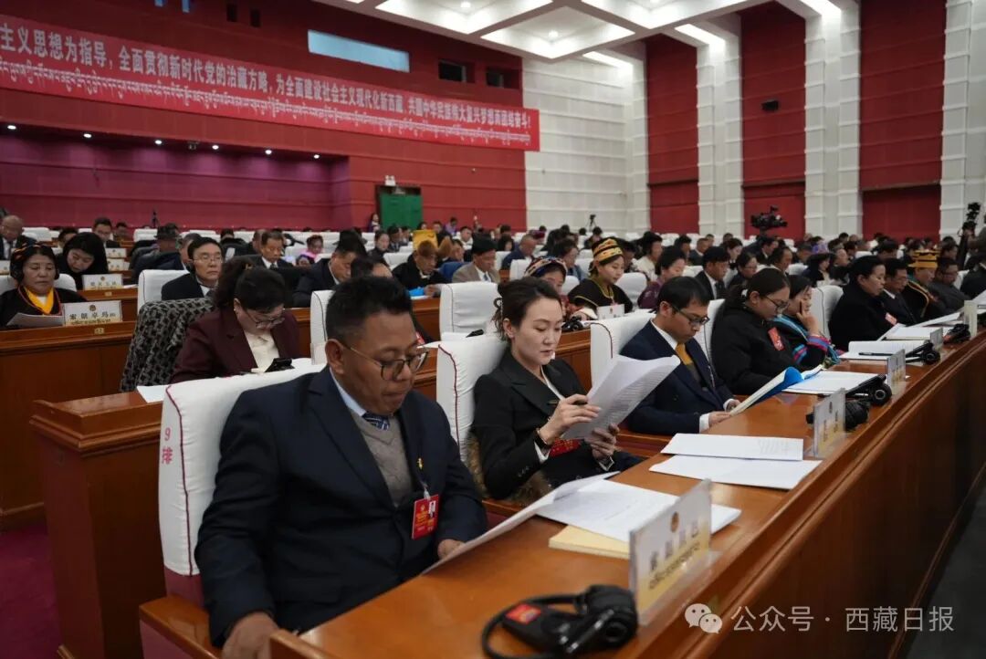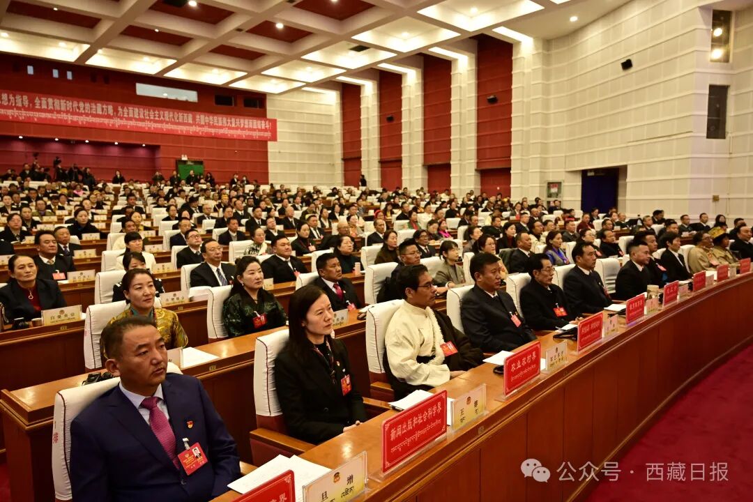 自治区政协礼堂,气氛庄重热烈。象征全国各族人民大团结的政协会徽悬挂在主席台正中,十面红旗分列两侧,会场内高高悬挂着大红横幅:高举中国特色社会主义伟大旗帜,以习近平新时代中国特色社会主义思想为指导,全面贯彻新时代党的治藏方略,为全面建设社会主义现代化新西藏、共圆中华民族伟大复兴梦想而团结奋斗!