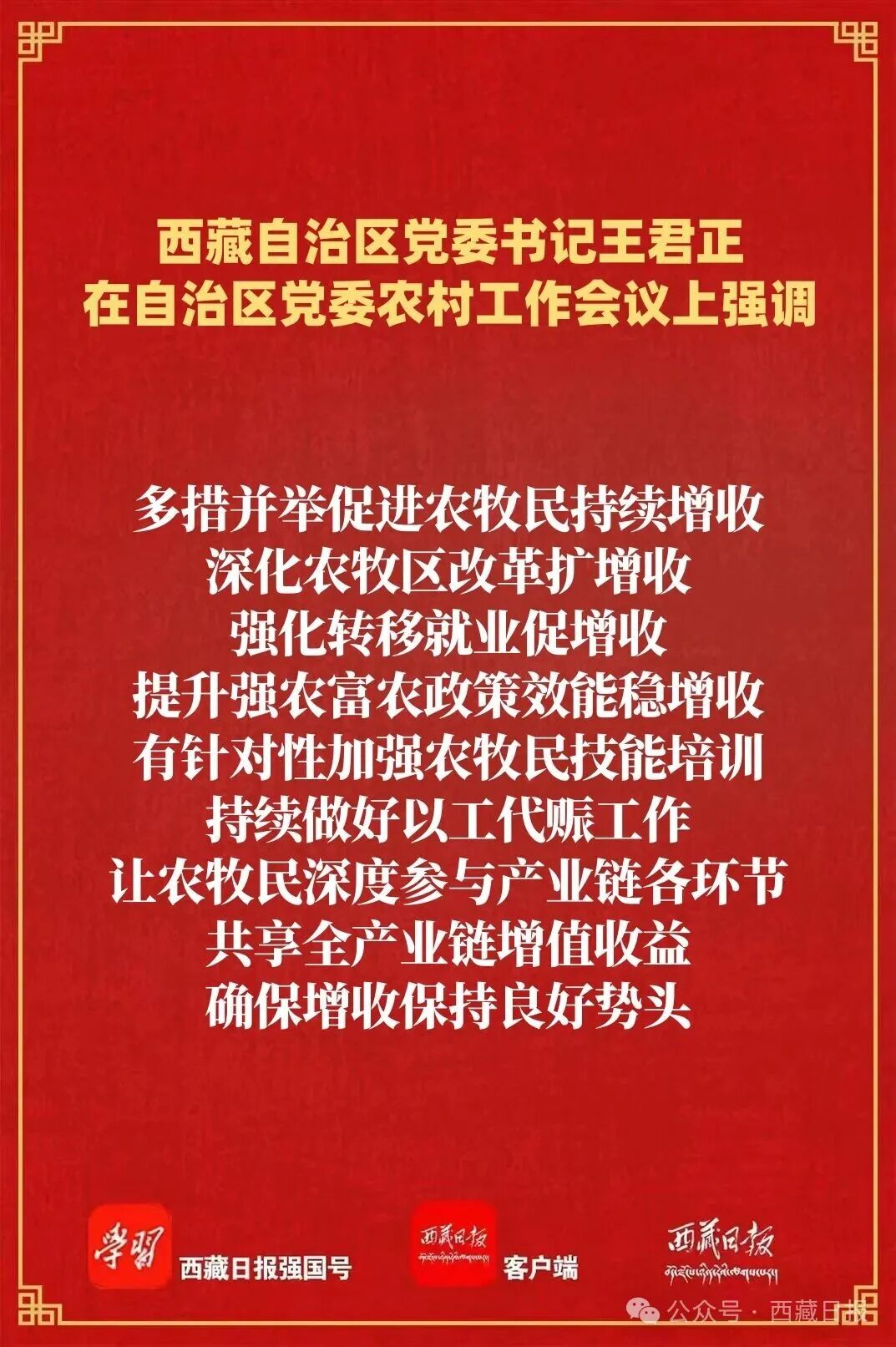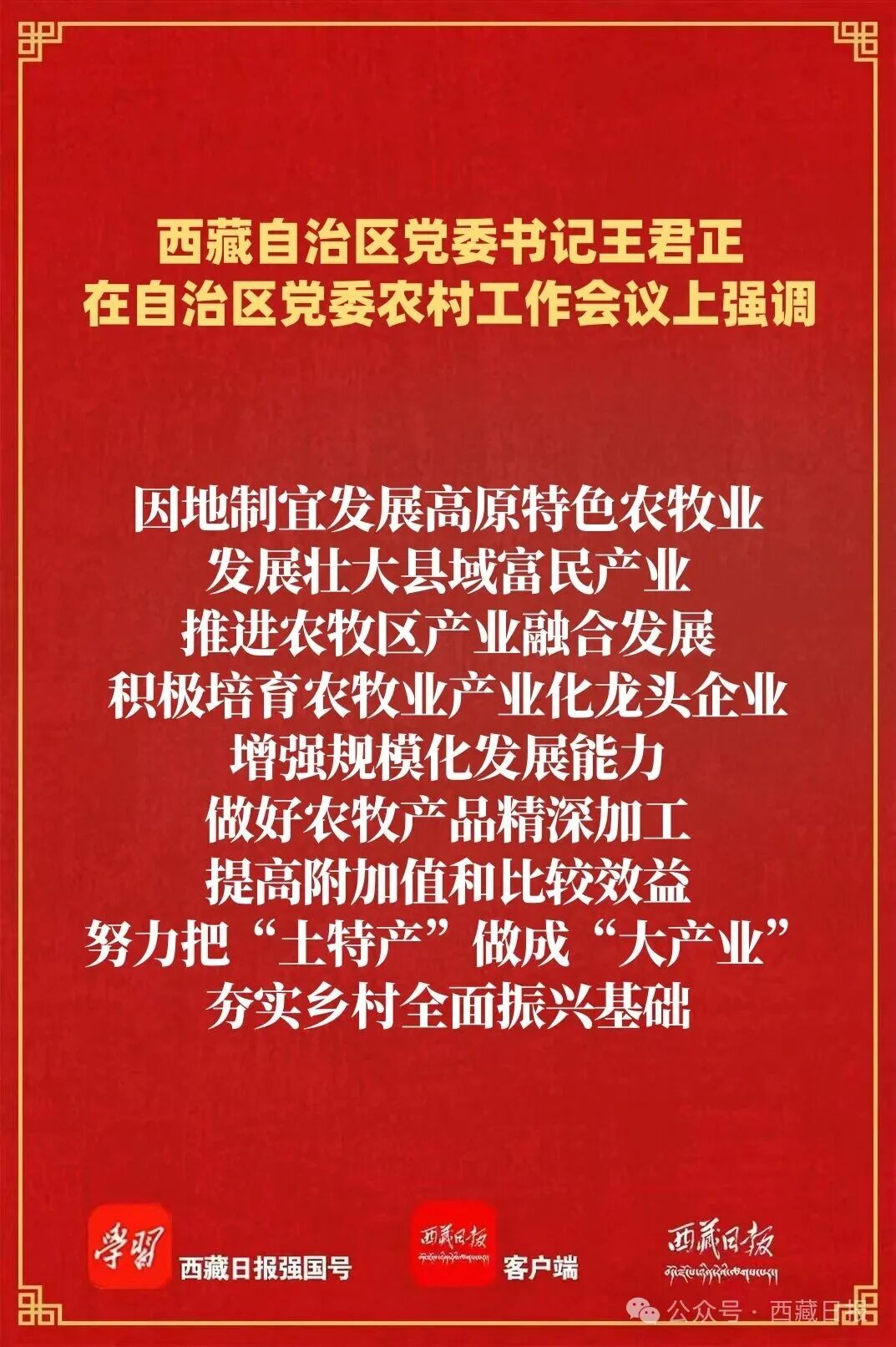 王君正强调,要锚定目标任务,突出工作重点,努力开创我区农业农村现代化、乡村全面振兴新局面。高度重视“三农”工作,深刻认识做好“三农”工作是全面建设社会主义现代化新西藏、持续抓好“四件大事”落实、巩固党在西藏的执政根基的必然要求,大力支持“三农”工作,努力实现全区农业基础更加稳固、农村地区更加繁荣、农民生活更加红火。多措并举促进农牧民持续增收,深化农牧区改革扩增收,强化转移就业促增收,提升强农富农政策效能稳增收,有针对性加强农牧民技能培训,持续做好以工代赈工作,让农牧民深度参与产业链各环节,共享全产业链增值收益,确保增收保持良好势头。大力实施常态化精准帮扶,及时精准做好监测识别,分类做好常态化帮扶,筑牢兜底保障防线,坚持把产业帮扶作为根本措施,优化产业帮扶方式,不断提升帮扶实效,确保不发生规模性返贫致贫。着力提升粮食和重要农产品产能,毫不放松抓好粮食特别是青稞生产,加强耕地保护和高标准农田建设,加强畜牧业和“菜篮子”产品生产供给,强化农牧业科技赋能,加大气象监测预报预警力度,增强农牧业防灾减灾能力。因地制宜发展高原特色农牧业,发展壮大县域富民产业,推进农牧区产业融合发展,积极培育农牧业产业化龙头企业,增强规模化发展能力,做好农牧产品精深加工,提高附加值和比较效益,努力把“土特产”做成“大产业”,夯实乡村全面振兴基础。加快推进高原和美乡村建设,深入学习运用“千万工程”经验,加快农牧区基础设施建设,提高教育、医疗、社保等公共服务水平,持续整治提升农牧区人居环境,把农牧区建设得更加宜居宜业。提高乡村治理水平,持续加强党建引领,充分发挥基层党组织战斗堡垒作用,深化文明乡风建设,推动形成向上向善的乡村道德风尚;坚持和发展新时代“枫桥经验”,不断提升基层治理体系和治理能力现代化水平,确保农牧区持续和谐稳定。