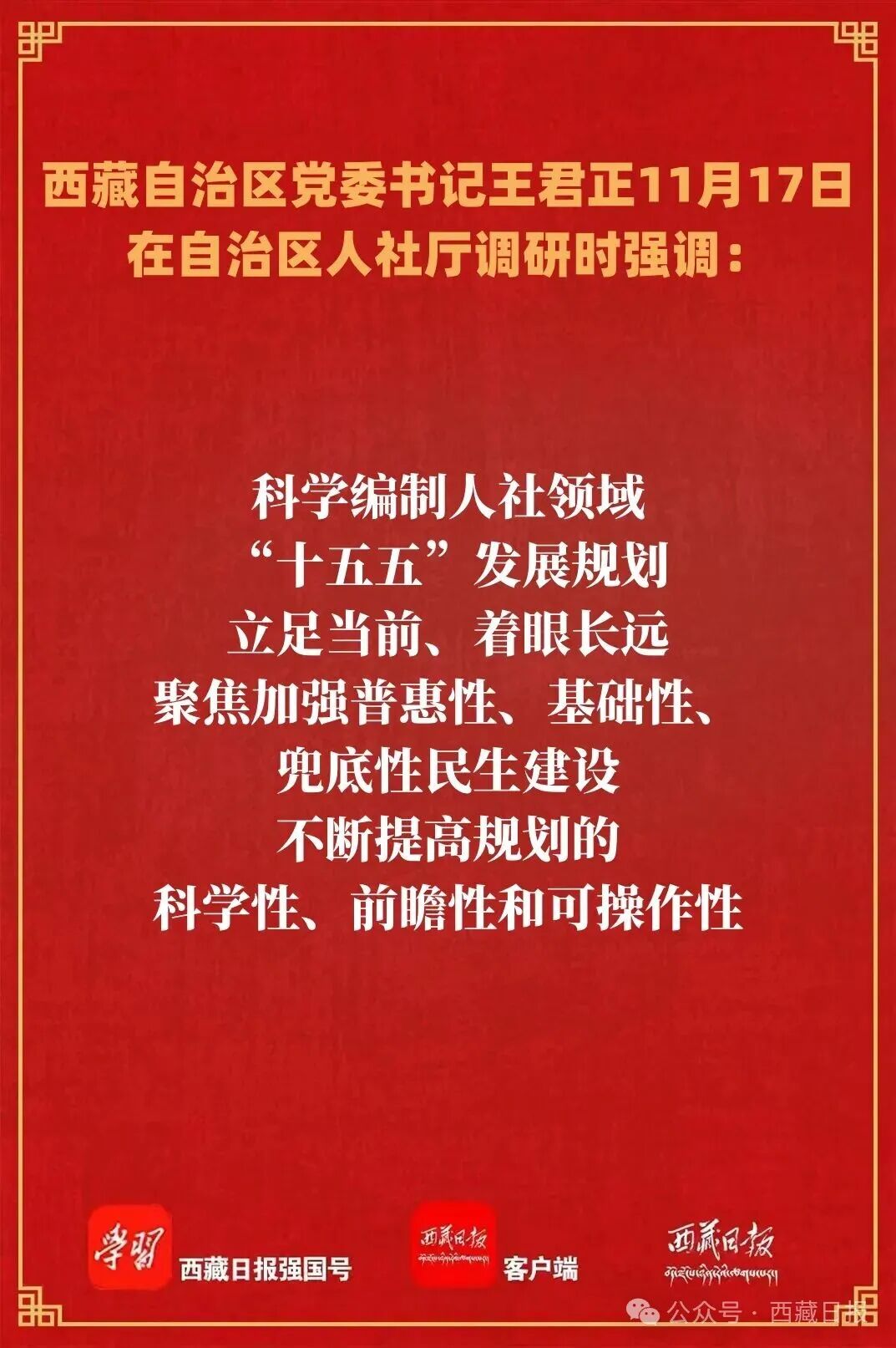 11月17日,自治区党委书记王君正在自治区人力资源和社会保障厅调研时强调,要深入贯彻落实党的二十届四中全会精神,坚持以人民为中心的发展思想,加大保障和改善民生力度,为社会主义现代化新西藏建设作出更大贡献。