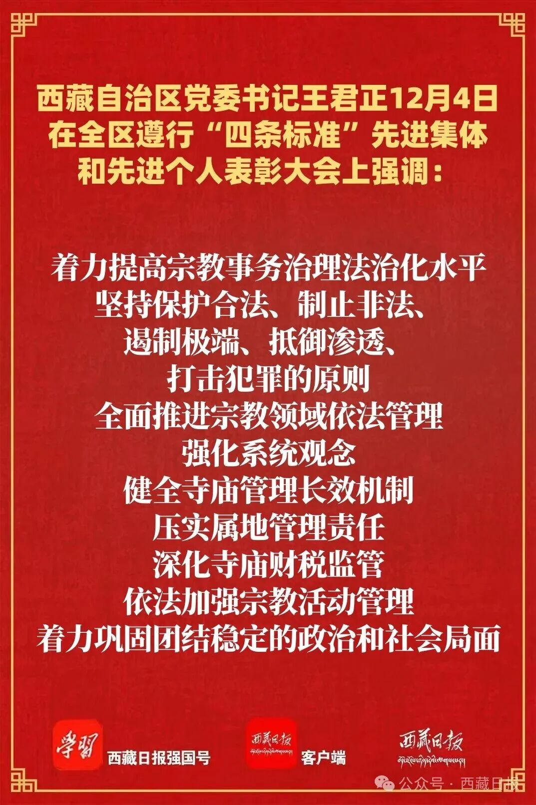 12月4日,全区遵行“四条标准”先进集体和先进个人表彰大会在拉萨举行。自治区党委书记王君正出席并讲话,强调要深入学习贯彻党的二十届四中全会精神,贯彻落实习近平总书记关于宗教工作、西藏工作的重要指示和新时代党的治藏方略,贯彻落实习近平总书记视察西藏时的重要讲话精神,按照自治区党委十届九次全会部署要求,突出分类指导,强化典型引领,积极推进藏传佛教中国化,努力为建设社会主义现代化新西藏凝聚力量。